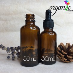 Chai đựng mỹ phẩm bằng thủy tinh màu nâu, nắp bóp kèm ống thủy tinh nhỏ giọt.