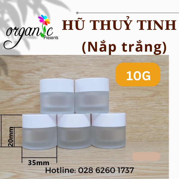 - Hũ đựng mỹ phẩm bằng thủy tinh màu trắng phun sương mờ, nắp nhựa trắng bóng. phía trong có lớp lót trên hũ.